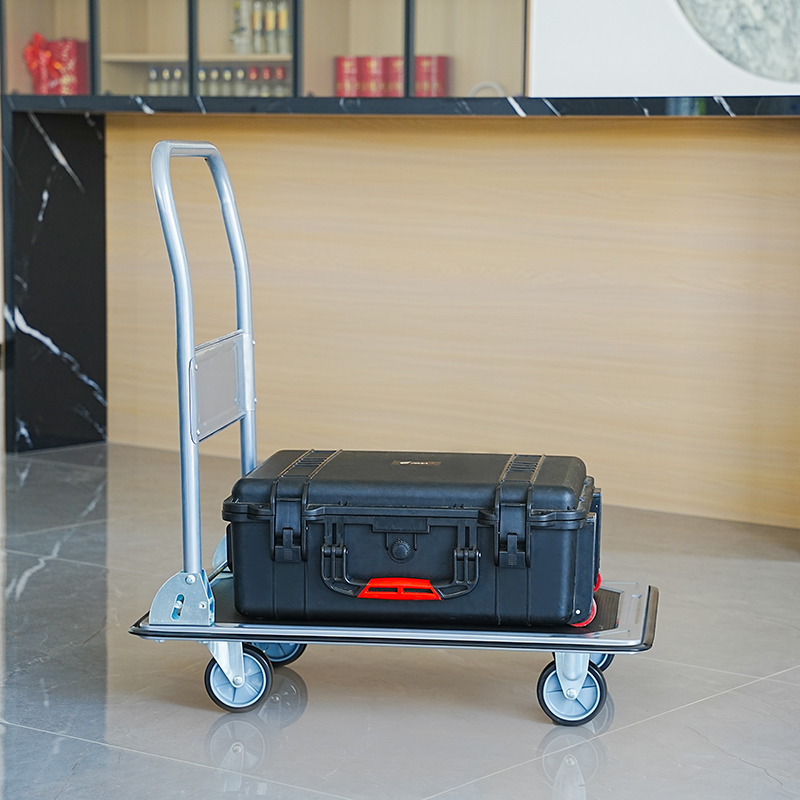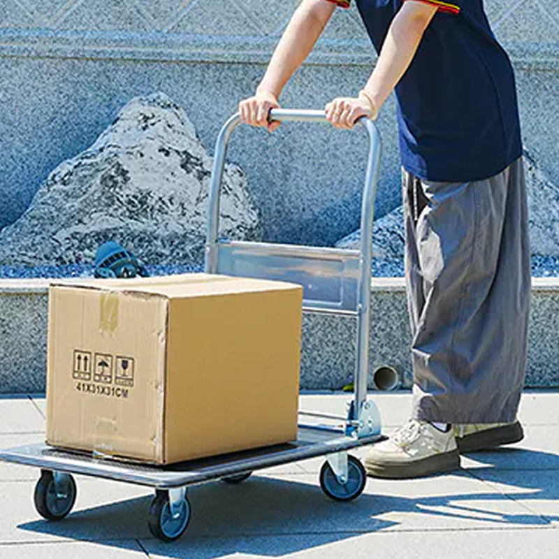 The foldable push handle allows compact storage and efficient shipping. Measuring 73 × 47 × 81 cm, it balances a strong platform with portability, making it ideal for warehouses, workshops, offices, or deliveries.
